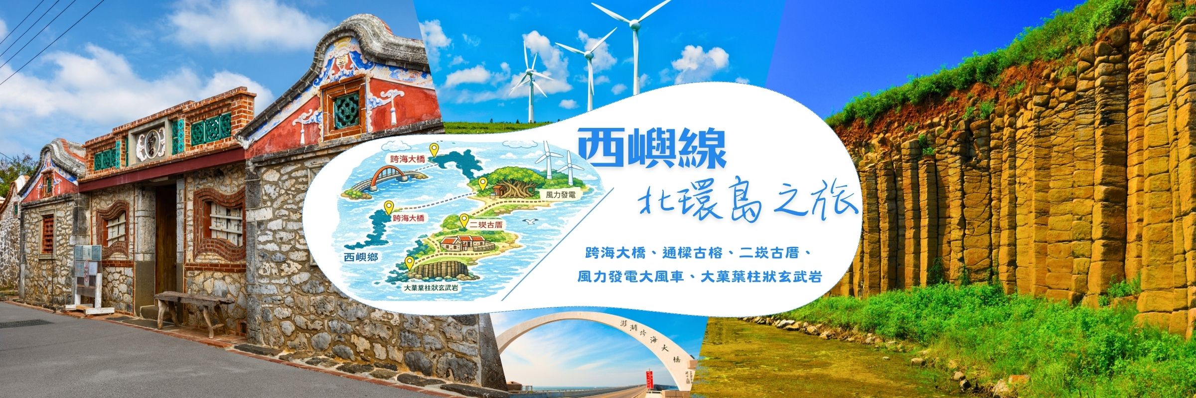 串聯澎湖最經典的海島風景,從氣勢磅礴的跨海大橋揭開序幕,漫步百年通樑古榕感受歲月靜好,迎著海風欣賞成排風力發電大風車的純淨景色,走進二崁古厝聚落體驗傳統閩式石屋之美,最後探訪大菓葉柱狀玄武岩,欣賞大自然雕琢出的壯麗岩壁,一次收錄人文、地景與海島風情的經典環島路線。