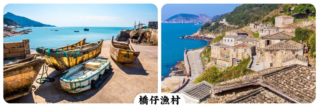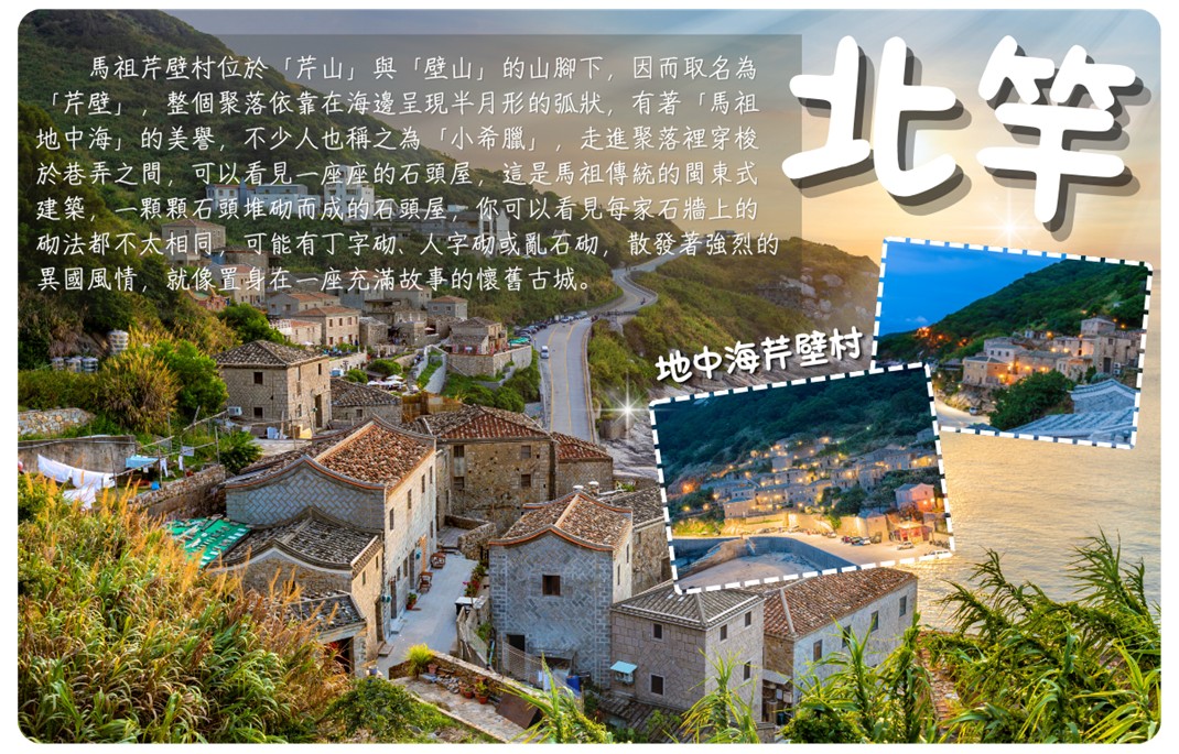 【橋仔漁村】馬祖話『橋仔』即『小橋』早年隨處可見小橋流水景象,是早期北竿往返大陸的轉口港,商業與漁業活動非常興盛。現在僅有住民幾十戶,但村內各廟宇神祗卻超過住民,有百餘尊之多。橋仔漁村的居民多數從事漁業,這裡的漁民世世代代生活在海上,依賴海洋資源為生。漁業文化在這裡深深扎根,傳統的漁船、捕魚方式以及海鮮交易等都成為了村落的日常特色。 想要看地中海美景,不用千里迢迢飛到國外去,來馬祖北竿就可以看到媲美歐洲石頭山城的浪漫風情!芹壁是馬祖列島中保存馬祖傳統閩東建築最完整、也最具代表性的地方之一,深受國內外建築、文化和藝術界的青睞。早年村民以捕蝦皮為生,70年代漁業沒落,居民大多外遷謀生,原本因人口外移而留下的空屋群,在政府有計畫的修繕下,轉變為民宿以及藝文空間等,讓一座座石頭屋回復昔日多樣化的風貌,穿梭在蜿蜒的山城中。
