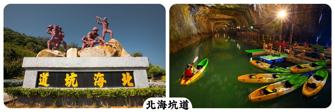 【北海坑道】1968年因應當時戰備需要,歷時三年完工,全長約800公尺,可提供百艘登陸小艇停放。北海坑道的最突出特點是其地下設施,遊客可以進入坑道內,探索當年用來防守馬祖的各種設施。除了坑道內的歷史設施,北海坑道所處的位置也使其擁有壯觀的自然景觀。
