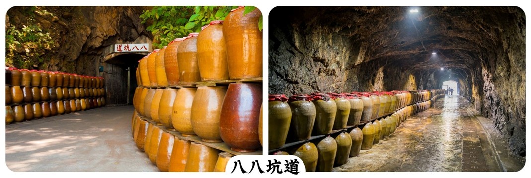 【八八坑道】是位於馬祖南竿島的一個歷史性軍事設施,這座坑道的名字來源於其建設年代1988年。當時為了應對外來威脅、保障當地居民與軍事設施安全而興建的一個防空洞。坑道長度超過200公尺,有多個不同功能的區域,包括指揮中心、休息區、醫療區、倉庫以及生活設施等。這些設施能夠在戰爭或空襲時提供全面的防護與生存空間。現今打開了八八坑道的大門,就像是開啟了一段窖藏的祕辛,坑道口兩旁擺著滿滿酒甕、上方有著「八八坑道」四個字,走進坑道,內部可是相當涼爽,長年維持在攝氏16-19度,恆溫又穩定的環境,讓存放的老酒有一定品質,是絕佳的儲藏酒窖,坑道主體由花崗岩所構成,而坑道所在,就位於馬祖酒廠斜前方不遠處。