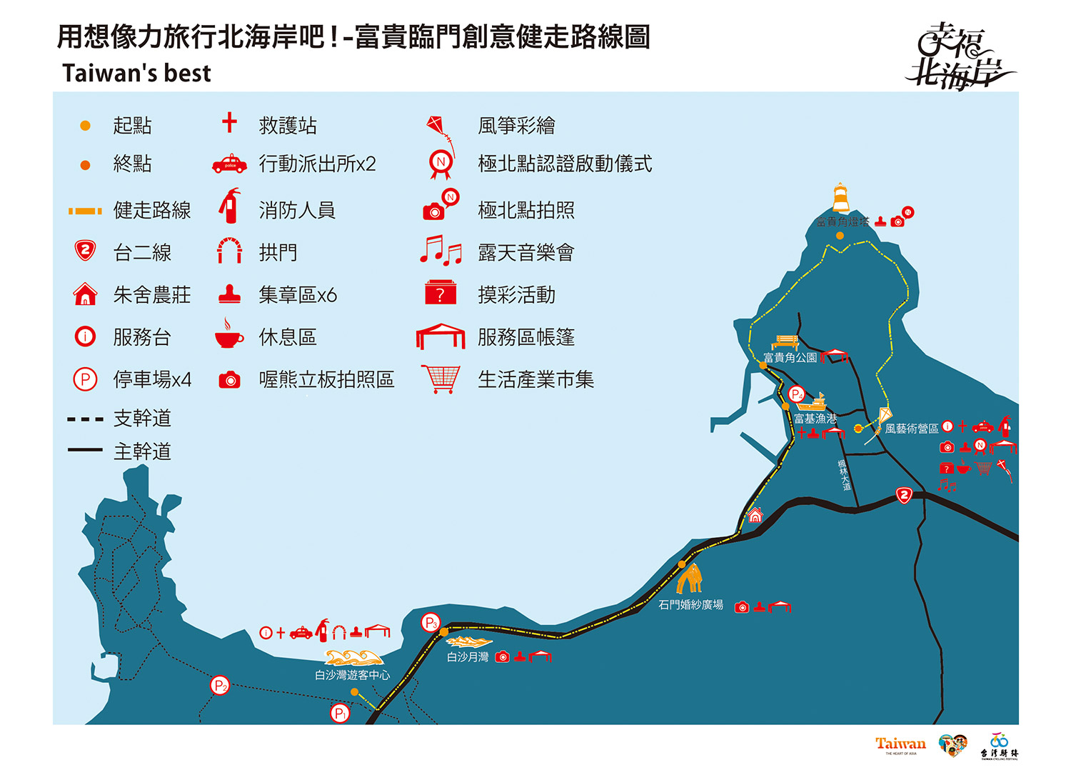 沿途健走集滿(白沙灣遊客中心→白沙月灣→婚紗廣場→富基漁港→富貴角燈塔→藝術營區)6個章,即可參與終點-富貴角藝術園區露天音樂會(摸彩),贈品有運動水壺50組、美利達時尚18段變數自行車3台好禮大放送。 |