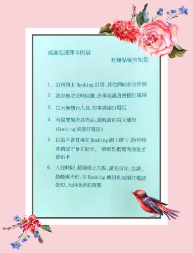 請提前告知您預計抵達的時間。您可以在訂房時使用特殊要求方框通知對方,或透過確認函上提供的聯絡資料直接與住宿處聯繫。客人需在辦理入住時出示附照片的身份證明文件和信用卡。請注意,特殊要求將視實際狀況安排,有可能會產生額外費用。客人需於入住前轉帳預付訂金,以作為訂房擔保。住宿處會在完成預訂後聯繫您,提供銀行轉帳相關指示。此住宿不接受群聚打牌、看運動賽事、單身派對等類似聚會。
