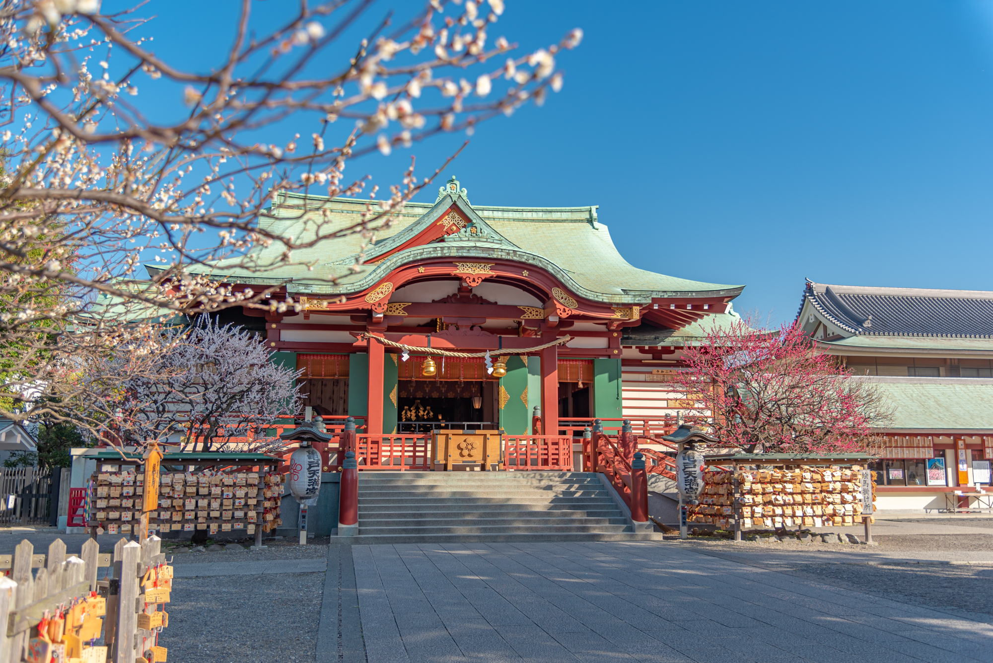 龜戶天神社是供奉學問之神菅原道真的神社,為「東京十大神社」之一。相傳神社以菅原道真的後裔菅原大鳥居信祐在此祭祀先祖神像為起源。後來於1662年模仿九州「太宰府天滿宮神社」建造了神殿、迴廊、心字池、太鼓橋等,形成了如今的模樣。作為九州太宰府天滿宮的關東分社,龜戶天神社也被稱為「東宰府天滿宮」或是「龜戶宰府天滿宮」。架設在心字池上的三座朱紅色的木橋,分別為代表過去的男橋、表示現狀的平橋,以及展望未來的女橋。據說每渡過木橋即能令心靈得到淨化。