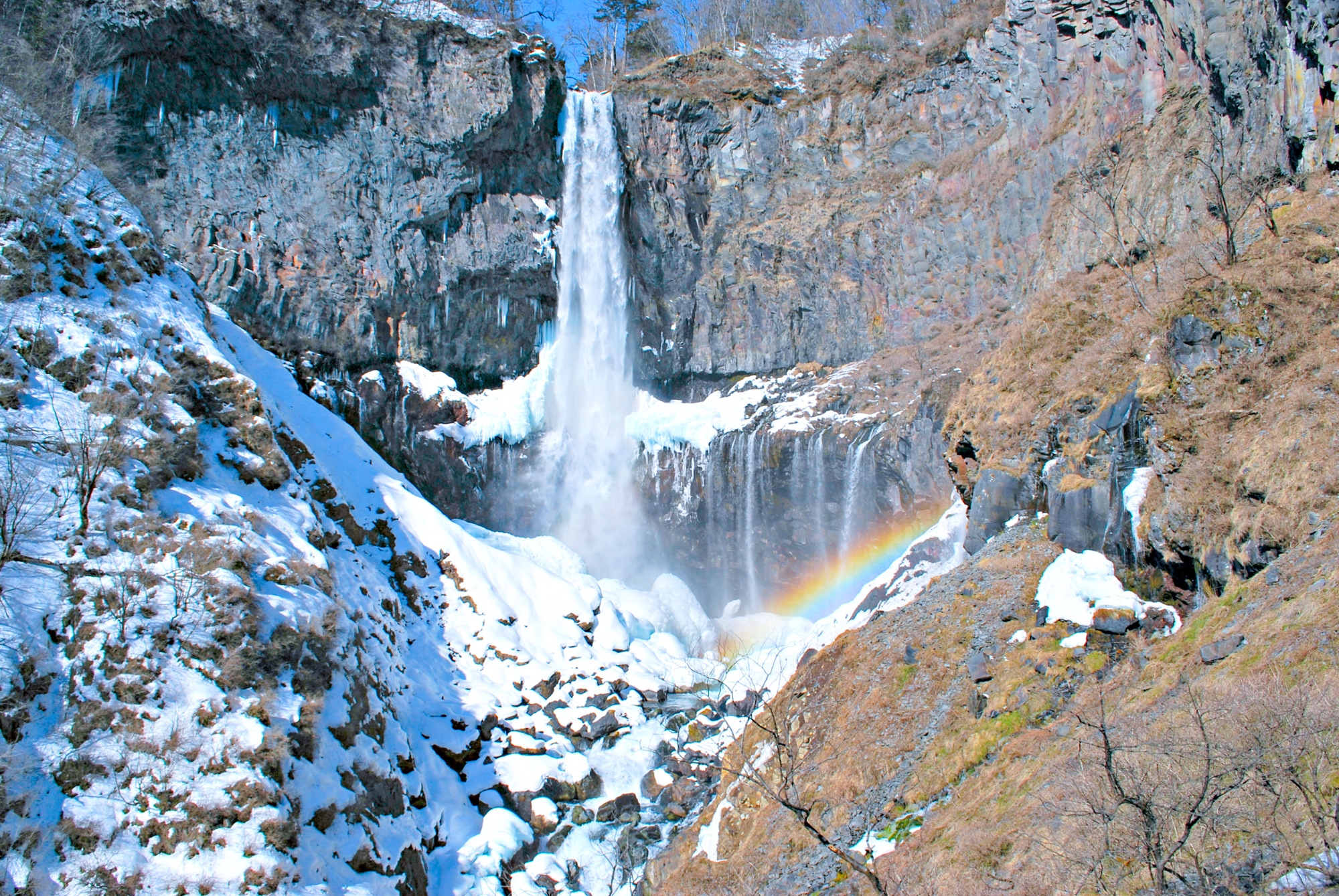 位在栃木縣日光的華嚴瀑布,與茨城縣的「袋田瀑布」、和歌山縣的「那智瀑布」統稱為『日本三大瀑布』。中禪寺的湖水從97公尺高度的岩石陡壁之上傾瀉而下的瀑布聲勢浩大,能感受到大自然撼動人心的力量和神奇的造物之美。從雙層瞭望台即可觀賞華嚴瀑布,但最推薦撘乘電梯前往最底部的瀑布潭附近的觀景台,能在近處聽到瀑布巨大的聲響,看到水花四濺的壯觀景色。一年四季都有美景可賞。春天從5月起一片綠意盎然; 6月有許多岩燕在瀑布周圍飛翔;秋天的紅葉也相當美麗。到了冬季的1~2月期間,還能欣賞到藍色冰柱懸掛在瀑布上的「藍冰」。這是由名為「十二瀑布」的細小瀑布凍結成晶瑩剔透的藍色冰柱後形成的美景,相當值得一看。