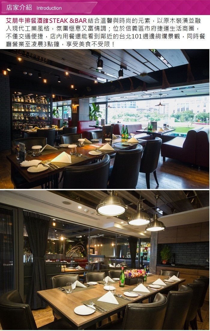 艾朋牛排餐酒館STEAK &BAR結合溫馨與時尚的元素,以原木裝潢並融入現代工業風格,氛圍愜意又富情調;位於信義區市府捷運生活商圈,不僅交通便捷,店內用餐還能看到鄰近的台北101週邊絢爛景觀,同時餐廳營業至凌晨4點鐘,享受美食不受限!