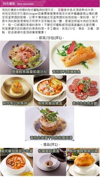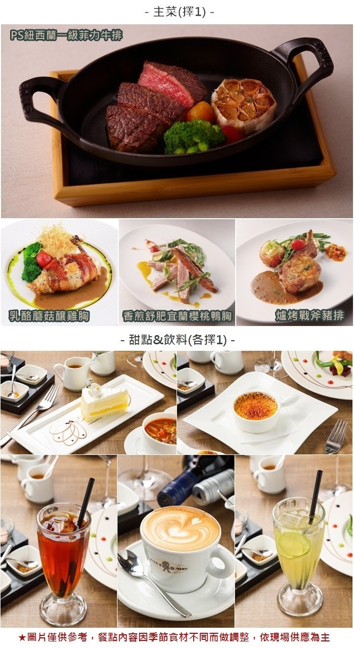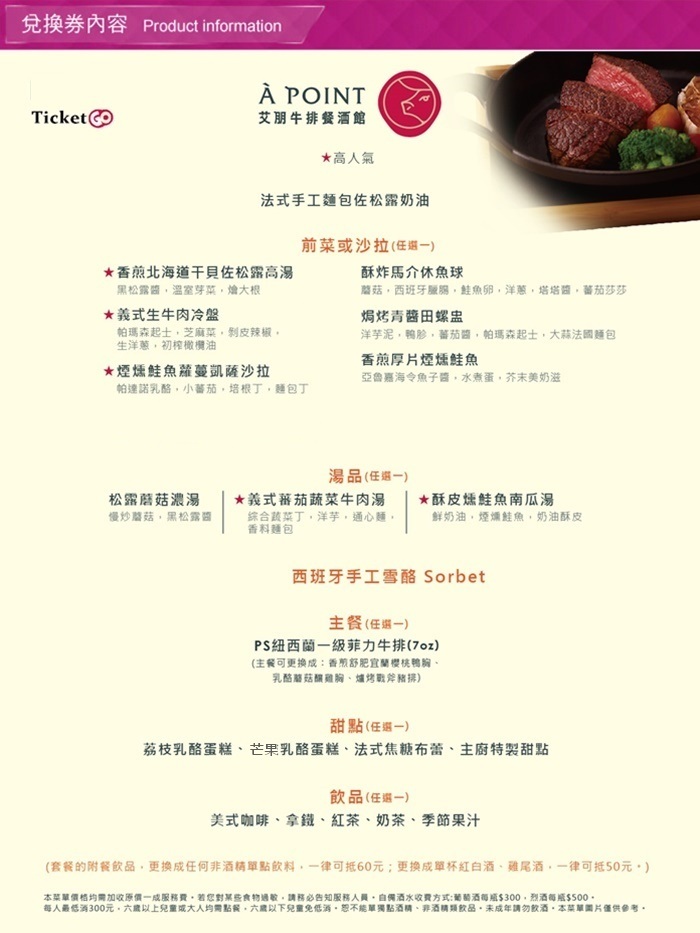 餐點內容:●主菜(擇1):PS紐西蘭一級菲力牛排(7oz)/香煎舒肥宜蘭櫻桃鴨胸/乳酪蘑菇釀雞胸/爐烤戰斧豬排●法式手工麵包佐松露奶油 ●西班牙手工雪酪Sorbet ●甜點(擇1):芒果乳酪蛋糕/荔枝乳酪蛋糕/法式焦糖布蕾/主廚特製甜點●前菜/沙拉(擇1):香煎北海道干貝佐松露高湯/焗烤青醬田螺盅/酥炸馬介休魚球/香煎厚片煙燻鮭魚/義式生牛肉冷盤/煙燻鮭魚蘿蔓凱薩沙拉●湯品(擇1)