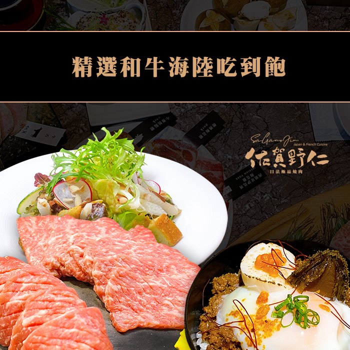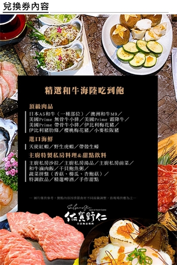 1.本券可1人於佐賀野仁│日法極品燒肉享用精選和牛海陸吃到飽乙客。(已含服務費)