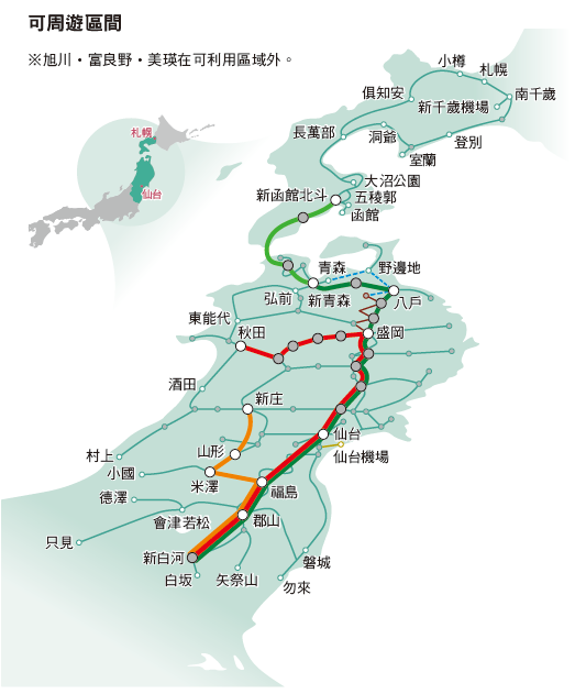 連續6天內不限次數搭乘指定區域內的列車、新幹線。