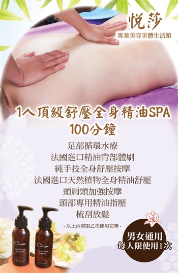 1.本券可1人(男女通用,每人限使用1次)於悅莎美容美體生活館使用頂級舒壓全身精油按摩SPA 100分鐘(手技90分)乙次。