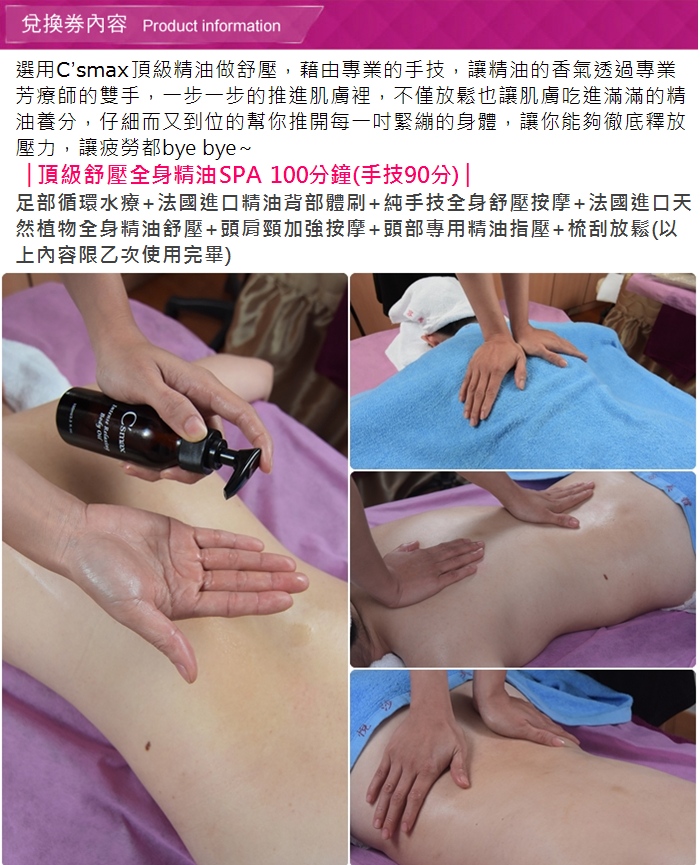 2.課程內容包含:足部循環水療+法國進口精油背部體刷+純手技全身舒壓按摩+法國進口天然植物全身精油舒壓+頭肩頸加強按摩+頭部專用精油指壓+梳刮放鬆(以上內容限乙次使用完畢)