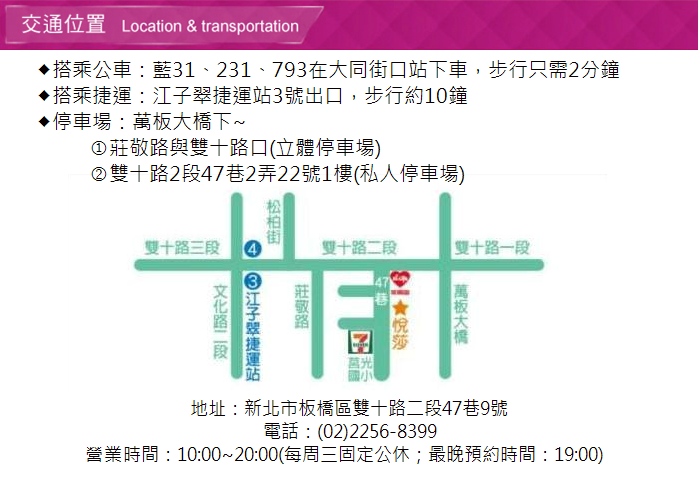 地址:新北市板橋區雙十路二段47巷9號(近江子翠捷運站3號出口)
