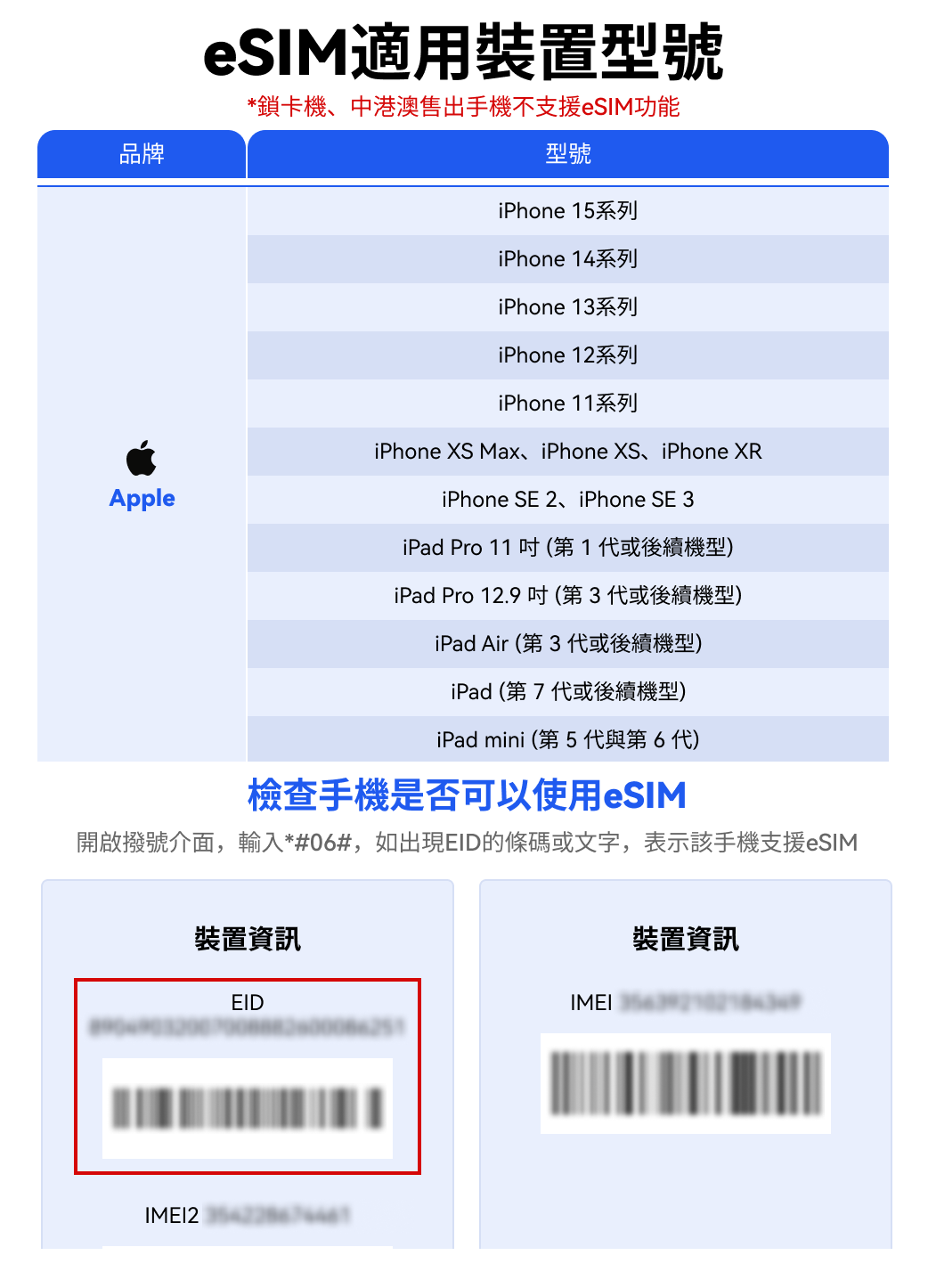 ※請在購買前先檢查手機是否可以使用eSIM:開啟撥號介面輸入*#06#,如出現EID的條碼或文字,表示該手機支援eSIM。※