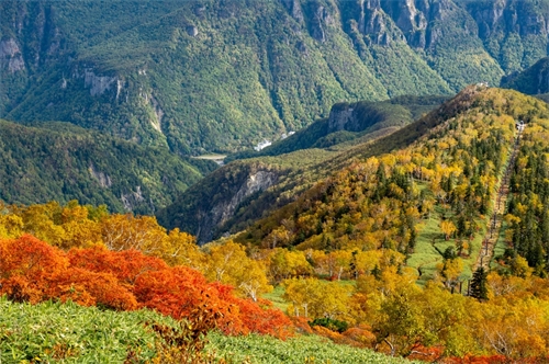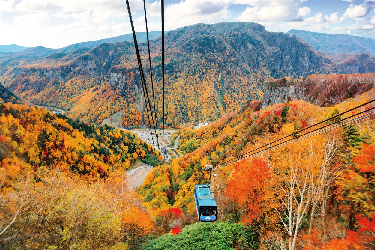 大雪山國立公園的層雲峽,位於北海道屋脊大雪山山麓,峽谷中佈滿高達 100 米左右的懸崖峭壁,這是凝灰岩受侵蝕後形成的地形。位於大雪山國立公園的北玄關口,有著柱狀節理的斷崖絕壁與連續峽谷,並有大雪山黑岳為雄大的背景,這樣壓倒性的景觀,四季的景色皆不相同,夏天有驚艷的高山植物,秋天有最著稱的紅葉,到春天為止的雪上活動讓人覺得興奮。特別安排搭乘黑岳纜車至黑岳五合目賞楓單程約7分鐘,由纜車上可眺望如詩似畫般的楓紅絕景。