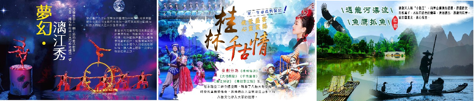 ※印象劉三姐秀如遇天候不佳,或其他因素停演無法觀賞,將以桂林夜間船遊四湖替代,造成不便敬請見諒。