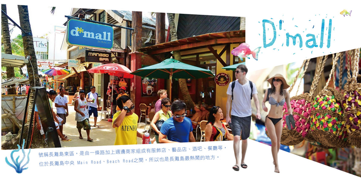 【DMALL導覽】最最最重要的事!就是跟著導遊到二號碼頭(STATION2)的DMALL導覽一番,因為這是長灘島最多餐廳所在地、也是長灘島的購物中心喔!除了沿著沙灘區一帶的商店,DMALL則是許多商店的聚集之處,不僅有許多物美價廉的各式商品,品牌的商店也進駐於此,當然長灘島上手工的特殊藝品也有不少。各式BBQ、星光餐廳蒙古烤肉、法式、義式、西班牙式、日式、菲式、從餐廳到當地小吃豐富程度簡直就是長灘島的士林夜市一般方便。另外逛累了,這裡還有具有特色的冰品及點心店,補充能量後再上路吧!