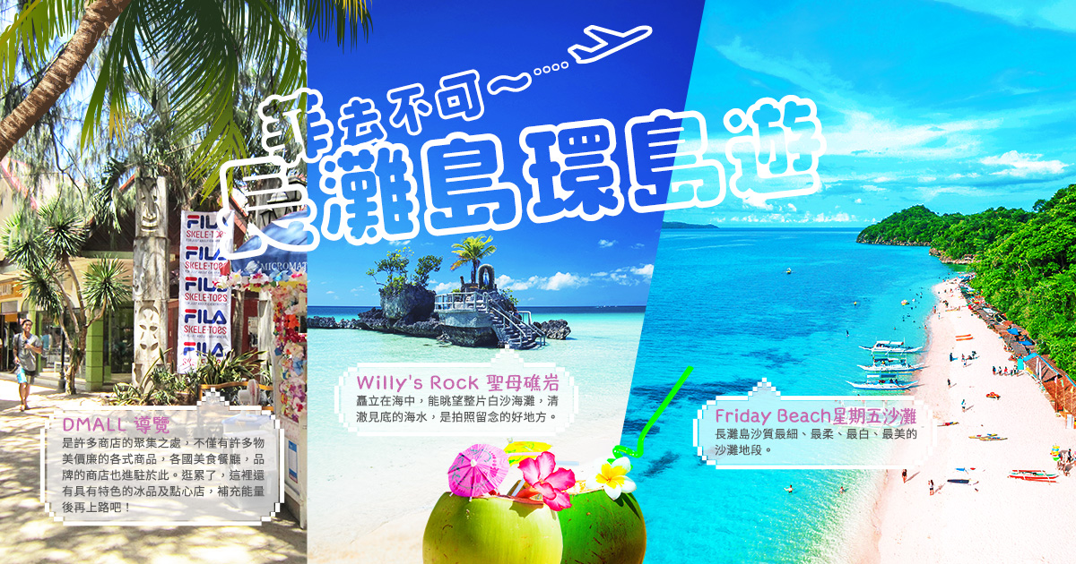 請您帶著最性感的泳裝,穿上涼鞋前往桃園機場搭乘豪華客機,短短的2.5小時的飛行時間,您已抵達被世界旅遊雜誌評定為世界上最美麗的海灘,抵達後由親切的導遊安排專車接您到碼頭換乘蜘蛛遊艇前往造訪世上最美麗的海灘-【長灘島】,在藍天,碧海,清風,白沙的大自然美景下揭開與大自然共舞之序幕。驚豔於世的美景加上映入眼簾的純靜自然與落日餘暉通紅的火球降臨在地平線的另一端。